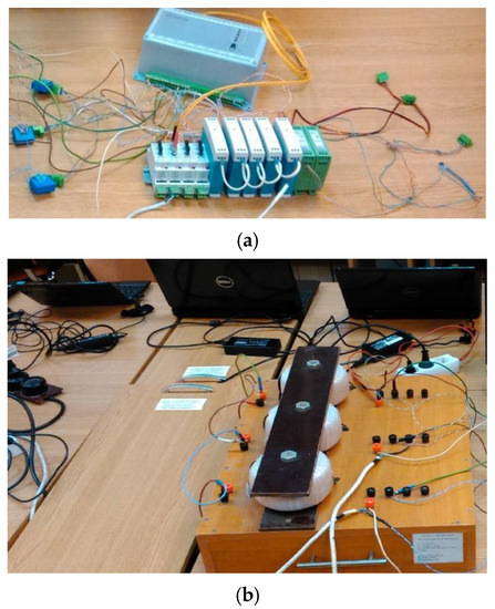 The set-up for measurement: (a) left—DAS with sensors for current; middle—DAS supplying sources; right—connectors toward laptop(s) (right) [22]; (b) Partial representation of the test setup with single/three-phase consumers connected to the secondary winding of transformers specially manufactured for these applications in toroidal forms.