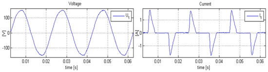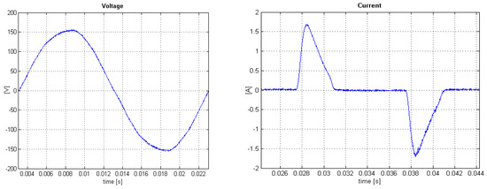 Waveforms acquired with a sampling frequency of 19.2 kHz. (Left)—voltage drop across terminals, (right)—currents absorbed by EUT [16].