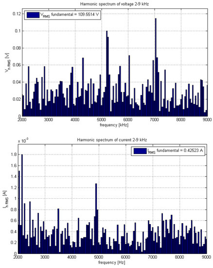 Figure 5. Harmonic decompositions of voltage and current in the range (2–9) kHz: (top)—volage; (down)—current. - (c)