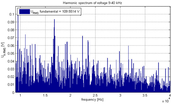 Figure 6. Harmonic decompositions of voltages and currents within the range (9–40) kHz: (top)—voltage; (down)—current.