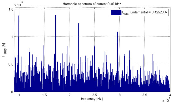 The magnitudes of harmonics for frequencies within the ranges (2–9) kHz and (9–40) kHz are small. Therefore, imposing a minimum threshold for their magnitude as a condition for their consideration (e.g.,—as in the case of PQ problems—Figure 4) should result in their neglect. Despite the questionable accuracy in evaluating them, our analysis revealed harmonic currents with magnitudes of x µA or even x mA (as in Figure 5 and Figure 6). These currents can interfere with other currents of common or differential mode and EMIs might be generated. As the load is highly variable, these currents are submitted to significant variations too, and therefore a deeper analysis concerning them should be made.