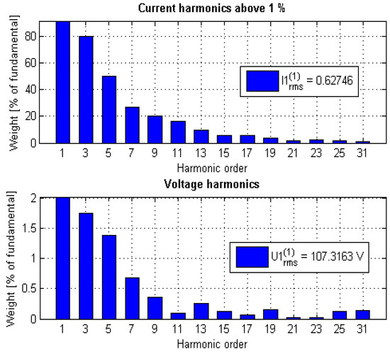 Weights of active powers (top) and reactive powers (bottom) for harmonic weights exceeding 1% from the component oscillating at 50 Hz, up to the maximum harmonic of 31.