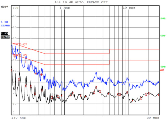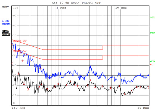 The standard CISPR 16-2-1 [28] was used for test setup measurements. The compliance of the measured CEs considers 2 types of upper limits: for QP and AV values, respectively.