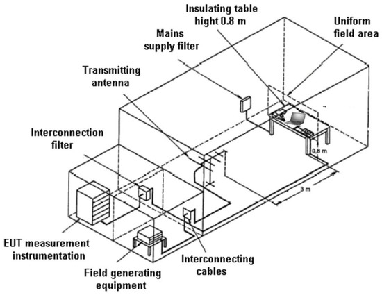 A list with characteristics of GTEM cells that make them a good choice for this type of tests includes: (a) very well-defined field configurations that can be generated inside them, such as to comply with the standard IEC/EN 61000-4-20 [29,36]; (b) no additional antennas and consequently no GTEM cell internal cables being required, which means that the tests’ reproducibility is high; and (c) ease of use [36].