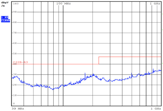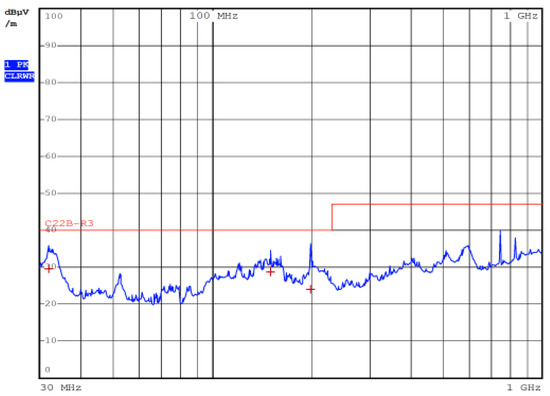 The analysis of the QP values reveals that none of them exceeds the maximum allowed limit of 40 dB(μV/m) for the range (30–230) MHz and 47 dB(μV/m) for the range (230–1000) MHz [29]. The two frequency ranges considered are related to the Standard used—CISPR 22—which has different values for radiated emissions, both for horizontal and vertical polarization, for the frequency ranges mentioned above.