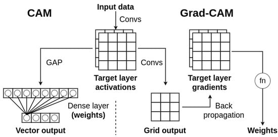 Algorithm scheme comparison between CAM and Grad-CAM methods. Target activations are the same for both methods. The difference is observed in activation weights; in CAM, we derive them from dense layer weights, whereas in Grad-CAM we use backpropagation to obtain gradients of target layers and calculate weights based on them.