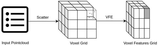 In VoxelNet [14], the authors introduced voxel-wise processing of LiDAR pointcloud (Figure 2). A whole 3D space around the sensor is divided into small cubic cells called voxels, then voxel features are calculated based on pointcloud data inside each voxel by a small network called Voxel Feature Extractor (VFE). Further 3D convolutional layers process those voxel features, completely omitting point-wise processing. A voxel transformation is invariant to any permutation of initial pointcloud data, and it addresses the problem of input data dimensions as it yields fixed feature tensor, depending only on a voxel’s size parameters. Extending the VoxelNet method, a PointPillars [15] architecture stacks all vertical voxels along the z-axis into so called pillars. This results in further processing layers being 2D convolutions instead of 3D, which are much faster in execution and have less trainable parameters but provide the same quality of predictions.