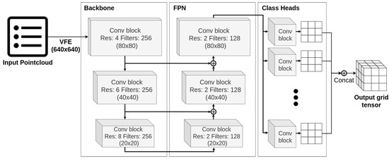 Proposed object detection LiDAR network architecture. Input pointcloud is processed voxel-wise by VFE block. Then, Backbone and FPN convolutional blocks form a U-shaped core network. Lastly, per class prediction heads yields output grids, which are concatenated into an output tensor.