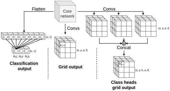 Comparison between different types of model outputs. The classification network outputs a vector of class probabilities, which could be used as a class score as is. The grid tensor output is a more complex structure with four dimensions (x, y, anchors, and features), where class probability values are embedded into feature vector along the fourth dimension. The multi-head output for each class is similar to the grid tensor, but due to the concatenation of all heads it has one additional head dimension (x, y, heads, anchors, and features).
