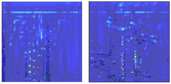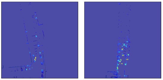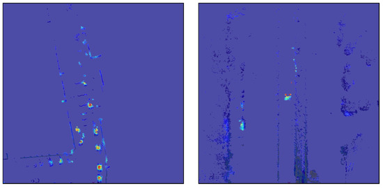 Our initial experiment concerned applying the Grad-CAM method to a LiDAR pointcloud processing network with a minimal modifications needed for it to work when compared to original vision application. The activations are obtained during feed-forward inference, so the only missing element to create CAMs are the weights. In order to determine the activation weights, we needed to propagate gradients from the class score value to a target convolutional layer. We used our proposed algorithm described before for the multi-head network output to accumulate a class score across whole prediction grid, then fed it into a backpropagation algorithm. Then, with a use of an original Grad-CAM formula, we extracted weights from the gradients. We tried different target convolutional layers to calculate CAMs. After checking several possible candidates, the best visual results came from the class head layers near the prediction output. The first Grad-CAM results for pointcloud data (Figure 8) look appropriate, in a sense that the created map highlights objects in a scene, which proves our method of accumulating a class score across output grid and generating weights captures activations responsible for yielding object predictions. On the other hand, we found them inaccurate detail-wise compared to the sensor resolution and also burdened with significant noise.