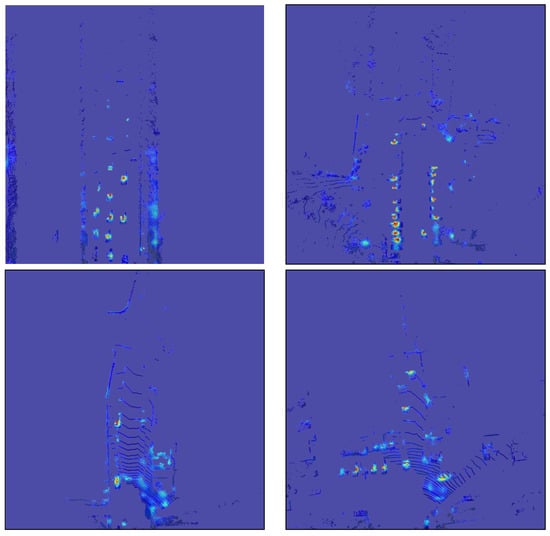 Combining all of our proposed solutions for Grad-CAM adaptation to LiDAR pointcloud network, in Figure 11 we demonstrate the final result of our work. We use voxel-wise processing and 2D Sparsity Invariant Convolutions to infer model output, as well as intermediate activations from a target convolutional layer. Then, based on the proposed algorithm, we determine the class score from a multi-head, multi-feature model output tensor. With backpropagation, we find gradients for target layer with respect to the class score, and then calculate the activation weights for CAMs creation. Finally, we fuse obtained CAMs with a LiDAR pointcloud mask to enhance them with a higher level of detail. The final result is a high resolution, detailed heatmap of input significance for an object detection task on a LiDAR sensor pointcloud, which is also free of any undesirable noise that could disrupt human visual analysis. In Figure 12, we compare results of Grad-CAM visualization for different classes of LiDAR object detections, namely car, track, bicycle, and pedestrian predictions.