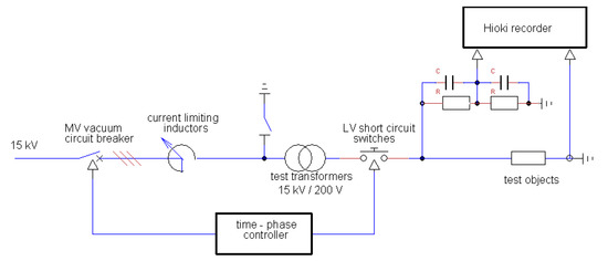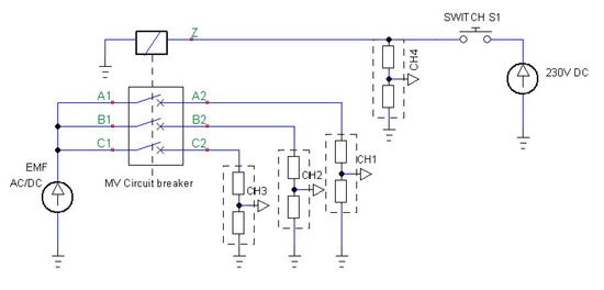 For confirmation or exclusion that the repetitive damped oscillatory waves are due to the closing of the contacts of the circuit breaker, the MV Circuit Breaker was dismounted from the MV circuit and connected, as shown in Figure 16. The tests were made with two types of electromotive forces EMF: