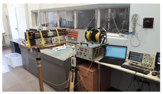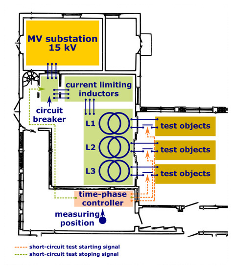 Electric and magnetic field strengths were measured in the control room by closing the MV circuit breaker. The current limiting inductors were dismounted from the circuit. The transformation ratio was set to 15 kV/0.2 kV. Only one transformer was powered, marked as No. L3 in Figure 2.