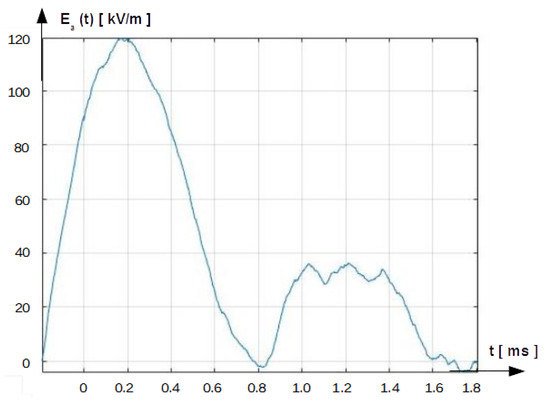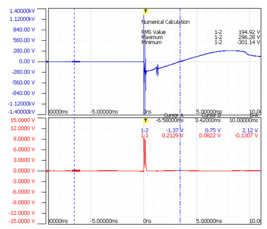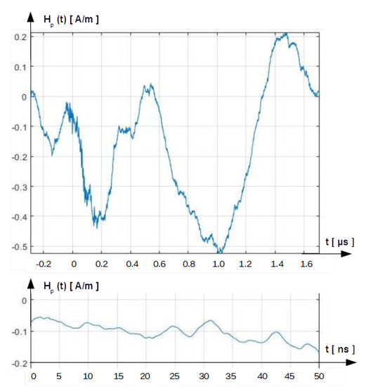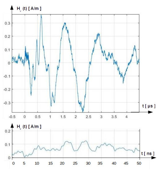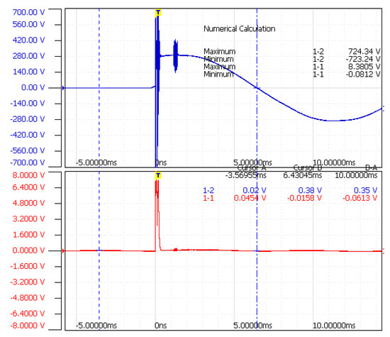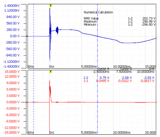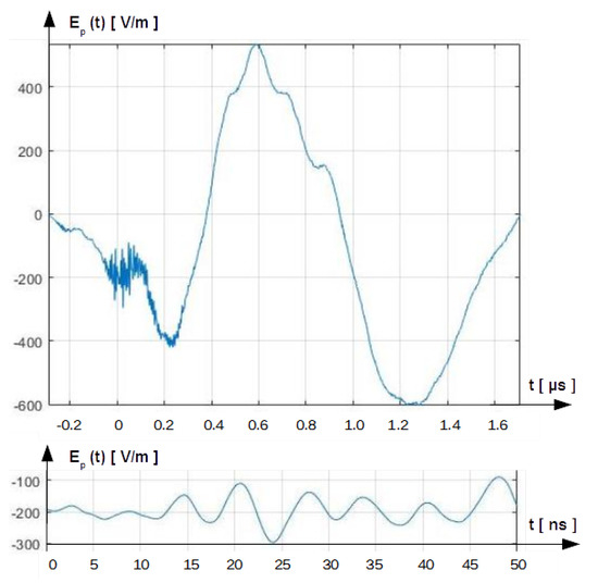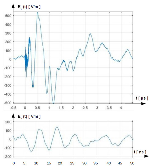 The time-dependent diagrams captured with field probes are presented in Figure 7, Figure 8, Figure 9, Figure 10, Figure 11 and Figure 12. The time-dependent diagrams captured with the HiCORDER 8861-50 are presented in Figure 13, Figure 14 and Figure 15. The important parameters of the recorded signals are gathered in Table 2 and Table 3.