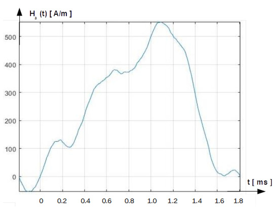 The component of the electric field along the separation wall is slowly varying in time but is extremely high, see Figure 11. It extends 100 kV/m. The magnetic field is also slowly varying in time and has a high peak value, reaching several hundreds of A/m, see Figure 12.