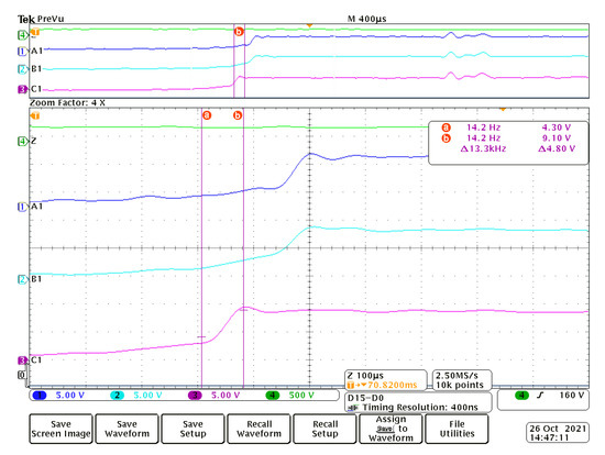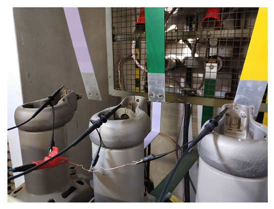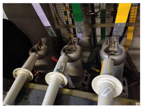 In the second case, four high-voltage probes P6015A—Tektronix—with 75 MHz bandwidth, 20 kV voltage range and 1000:1 division factor were used, see Figure 19.