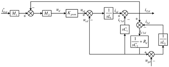 When the first-order LADRC method is adopted, the transfer function is as shown in Equation (18). The control structure diagram of its d-axis is shown in Figure 4.The control method of split capacitor current feedback can make the current between capacitors accurately track the given and does not contain the resonant sub-current, while there is a resonant pole in the closed-loop transfer function expression with as the output, and the resonant sub-current component in the grid-connected current will be large. In order to solve this problem, it can be considered to add a passive damping at the second capacitor , which can effectively suppress the resonance in the grid-connected current.