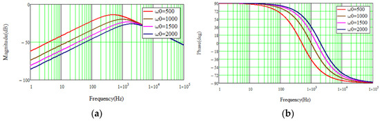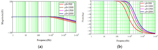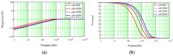 Let ; the magnitude and phase frequency curves of Equations (27) and (28) can be obtained as shown in Figure 6 and Figure 7, respectively.
