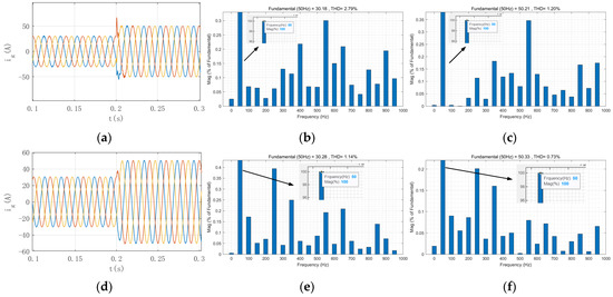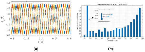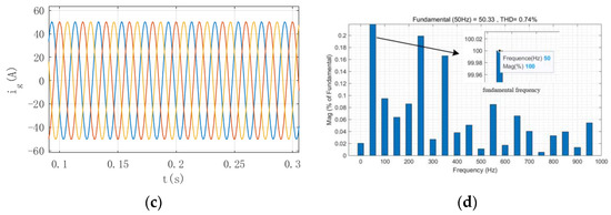 In different control modes, when the system reference current . When is changed from 30 A to 50 A, the waveform of the grid-connected current and the THD analysis before and after the current abrupt change are shown in Figure 8.