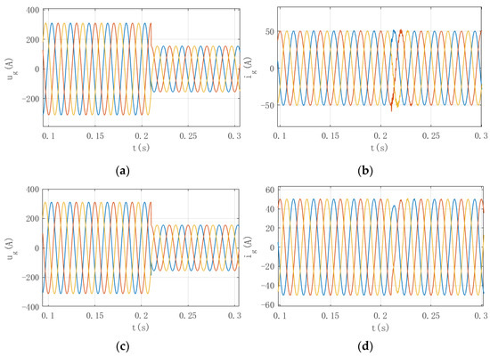 Grid voltage and grid current when grid voltage drops under PI control and LADRC control. (a) Grid voltage with PI control; (b) grid current with PI control;(c) grid voltage with ADRC control; (d) grid current with ADRC control.