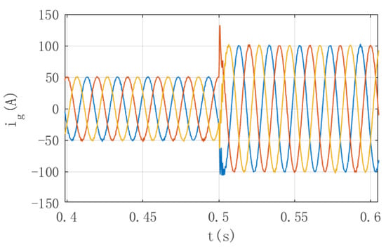Figure 12 shows the grid-side current waveform under the first-order LADR control. It can be seen from the Figure that when the reference current , changes from 50 A to 100 A in the vicinity of 0.5 s, the first-order LADRC control system can make the incoming current have good current quality and high control accuracy.