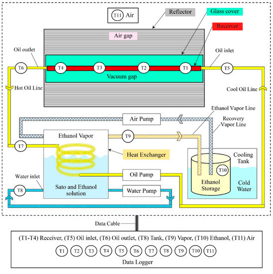 Schematic diagram of the vacuum-tube parabolic solar collector system in semi-automatic controlled ethanol distillation (drawn not to scale).