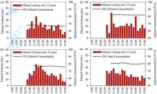 Ethanol volume and ethanol concentration at different solution concentrations: (a) 10% initial ethanol concentration, (b) 15% initial ethanol concentration, (c) 20% initial ethanol concentration, and (d) 23% initial Sato concentration.