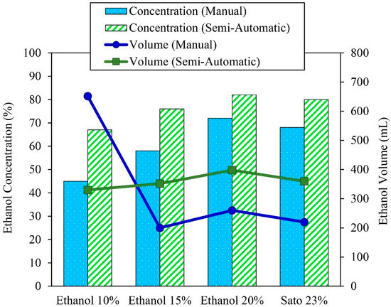 The semi-automatic controlled ethanol distillation using VPSC was designed and constructed to control the solution temperature by adjusting the flow rate of the oil in the heat exchanger. This is why the ethanol concentration after the distillation process in the semi-automatic controlled ethanol distiller was in the range of 60–80%, and the distilled ethanol volume was in the range of 300–400 mL. Figure 7 compares the distilled ethanol volume and ethanol concentration of the 10%, 15%, and 20% initial ethanol concentrations and the 23% initial Sato concentration between the semi-automatic controlled and manual controlled ethanol distillation process using VPSC.