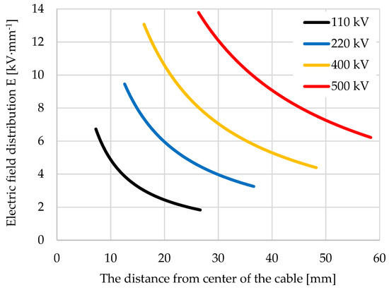 There is some coincidence between the obtained results and the data contained in the literature. In article [5], the authors provided the maximum values of electric field stress for a 500 kV cable (Emax = 18 kV·mm−1) and for a 320 kV cable (Emax = 17 kV·mm−1). Meanwhile, the Emax obtained in these investigations for a 500 kV cable was about 14 kV·mm−1, and for 220 kV and 400 kV cables, the maximum value of electric field stress was equal to 10 and 13 kV·mm−1, respectively. Some differences may have resulted from the different geometric dimensions of the cables.