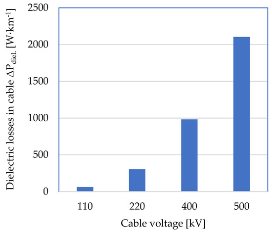 where: ΔPdiel.—dielectric losses (W), ε—absolute electrical permittivity of the insulating material (F·m−1), U—phase voltage (V), C—electrical capacity of cable insulation (F), tan(delta)—dielectric loss coefficient (-), and L—cable length (m).