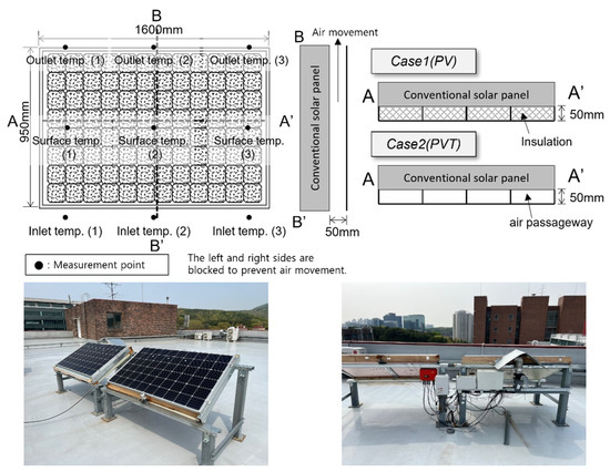 Measurements were made on the rooftop of Gyeonggi University (latitude 37.30°, longitude 127.04°) in Suwon-si, Korea [20]. In this experiment, by passing air under the existing PV panel, the increase in power generation due to the decrease in the temperature of the solar panel and the heat collection efficiency according to the temperature increase in the passing air were investigated. Changes in temperature and power generation under the same conditions were compared by dividing them into summer and winter seasons. The target panel faced south and was installed at an angle of 30 degrees, and the area of all target panels was 1.52 m2 (1600 mm × 950 mm). The target PV panel was composed of a single-crystalline silicon Passivated Emitter and Rear Cell (PERC). The conceptual diagram of the panel used in this experiment is described in Figure 1, and aspects such as the panel inlet temperature, upper/lower surface temperature, and panel outlet temperature were measured to investigate the temperature change in the upper and lower parts of the panel by passing air through the lower part of the panel. To compare the amount of power generation and power generation efficiency, solar radiation, current, and voltage were measured. Table 1 and Table 2 show the results of these measurements. The measurement was conducted every 1 s, and the average result for 10 min was shown considering the fluctuations according to the external conditions.