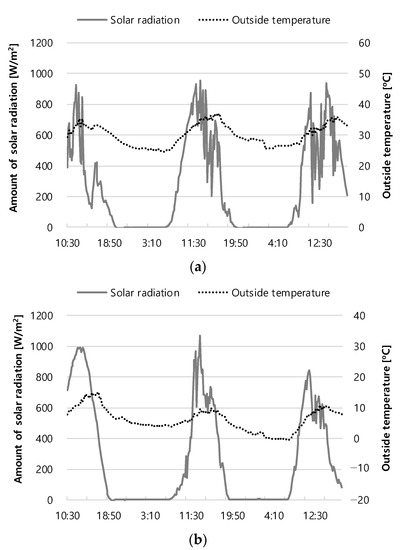 The experiment was conducted from 16 August 2021 to 25 March 2022. In the measurement period, data were analyzed based on the measurement results of three days in summer (18 to 20 August, ‘21) and three days in winter (21 to 23 March, ‘22). The three-day target was selected based on the data showing two or more sunny days, and the characteristics of each season were presented. Figure 2 shows the insolation amount and outdoor temperature in summer and winter. The amount of solar insolation on the panel side in summer was 3351 Wh, 5618 Wh, and 4019 Wh, respectively, for 3 days, representing an average of about 4329 Wh, and the outdoor temperature was measured as a minimum of 24.8 °C and a maximum of 37.1 °C. In winter, the amount of insolation on the panel side was 5638 Wh, 4823 Wh, and 4019 Wh, respectively, for 3 days, representing an average of about 4827 Wh, and the outdoor temperature was measured as a minimum of −7.6 °C and a maximum of 15.0 °C.