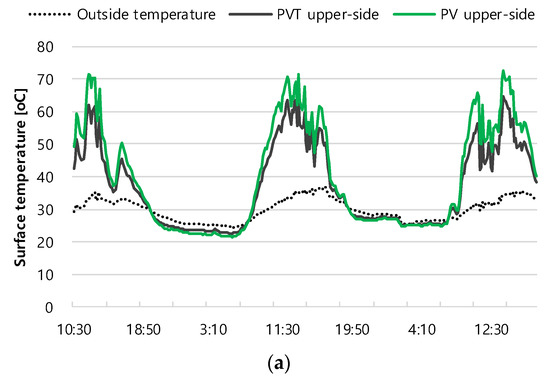 Figure 7 shows the heat collection effect owing to the increase in the temperature of the air passing through the PVT panel. The volume of air generated by the fan applied in this experiment was 4.82 m3/min (the fan had a diameter of 9 cm and the average wind speed was 12.63 m/s). In the summer, the maximum and average heat collection amount calculated from the temperature difference between the inlet and outlet of the panel, the amount of air, and the specific heat of air were 684.4 W and 326.0 W, respectively; in the winter, these values were 486.5 W and 252.8 W. It was shown that the air passing through the bottom of the PVT panel can reduce the surface temperature, increase the amount of power generated, and help collect additional thermal energy.
