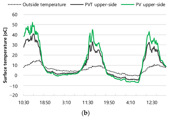 In the case of PVT panels, where air can pass through the lower part of the panel, the temperature decreased by up to 7.6 °C, compared to the existing PV at the top of the panel in summer, and the average temperature decreased by about 2.7 °C during the period. This temperature decreased by up to 11.3 °C and averaged 2.1 °C in winter (Figure 3). In contrast, in the case of the lower panel temperature, the temperature change was relatively insignificant, with a maximum of 1.8 °C and an average of 0.5 °C in summer and a maximum of 0.6 °C and an average of 0.1 °C in winter (Figure 4).