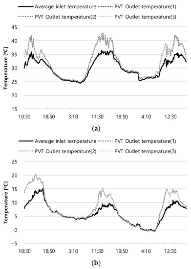 Outlet temperature of PVT panel: (a) summer; (b) winter.