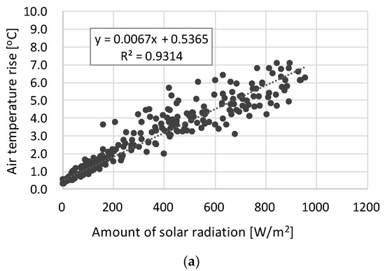 Relationship between insolation and outlet temperature rise: (a) summer; (b) winter.