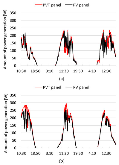 Power generation efficiency of PVT and PV: (a) summer; (b) winter.