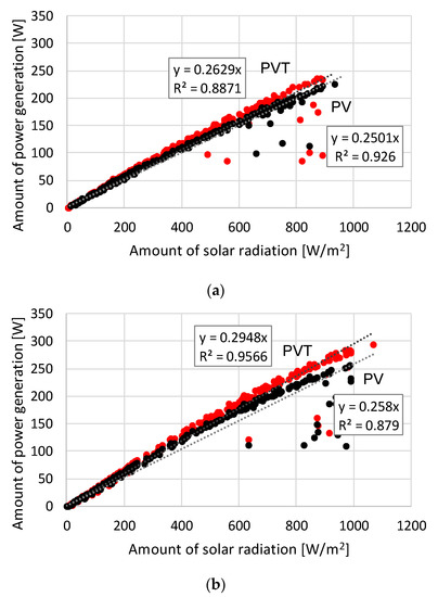 To investigate the effect of increasing the power generated by the PVT panels through surface temperature reduction by an air-based PVT system, the power generated by conventional PV and PVT panels in different seasons was compared. As shown in Figure 8, the maximum power generated by the PVT panel through which air can pass was increased by 11.0 W in the summer and 19.5 W in the winter. However, because it is difficult to quantitatively analyze the change in the amount of electricity due to changes in insolation, this study analyzed the relationship between solar radiation and the power generated by each PV and PVT panel. Figure 9 shows the correlation between solar power and power generation; as indicated in the figure, the power generated by a PVT panel increased by approximately 5.1% in the summer and 14.3% in the winter, compared to a PV panel for the corresponding period.
