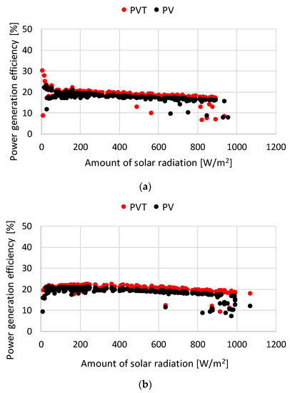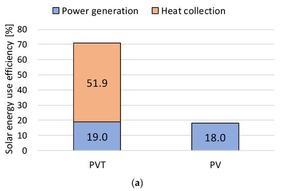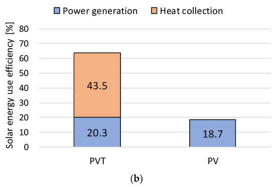 The power generation efficiency of PV and PVT panels was calculated based on the measured solar radiation and power generation. As shown in Figure 10, the power generation efficiency of the PVT panel was 19.0% in summer and 20.3% in winter, and the corresponding value for PV was 18.0% in summer and 18.7% in winter. Based on this, it can be confirmed that the increase in the power generation efficiency resulting from the air flow under the panel was approximately 8.6%. In addition, as shown in Figure 11, the solar energy utilization efficiency for PVT was 67.2%, based on an average annual heat-collecting effect of approximately 47.7%, which was a significant increase compared with the corresponding value of 18.3% for PV. However, for the application of PVT, it is necessary to not only increase the amount of power generated but also analyze the correlation with the heat load on the target building; additionally, it is crucial to review control measures at higher temperatures.
