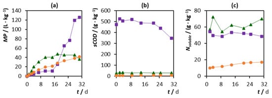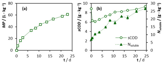 (a) Cumulative methane production (MP), (b) soluble COD (sCOD) and Nsoluble concentrations measured in the blank assays during the BMP test with dGS-5d. All parameters are expressed per kg of VS of inoculum.