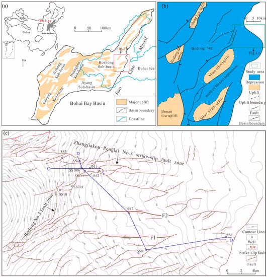 The eastern Liaodong area is located at the junction of Bodong Sag and Jiaoliao Massif [31,32,33], which is a positive structural belt at the basin margin (Figure 1a,b). At the beginning of the Cenozoic—affected by the collision between the Indian plate and the Eurasian plate [34]—the whole area underwent three developmental processes: fault depression, fault depression transition, and depression [35], with six stages of tectonic movements, which developed as a result [27,36]. Two tectonic movements were developed in the Neogene period, including the post-rift thermal sag stage and the Neotectonic movement stage. Four groups of fault systems were developed for the Neogene in the study area: NNE, NWW, NE and nearly EW. Among them, the NNE-trending faults are the extension of the Bodong No. 3 fault zone, which is the east branch of the Tan-Lu fault zone, while the NWW-trending faults belong to the Zhangjiakou-Penglai No. 3 strike-slip fault zone and its two derived strike-slip fault zones. The NE-trending and nearly EW-trending faults are the products of Neotectonic movement [37,38]. The Zhangjiakou-Penglai No. 3 strike-slip fault zone has the largest coverage among the NWW-trending faults, extending to Bodong Sag to the west, with its two derived strike-slip fault zones intersecting the Bodong No. 3 fault to the west (Figure 1c and Figure 2).