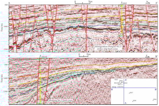 Seismic section AA′ and BB′ across the eastern Liaodong area, showing fault distribution, stratigraphic units and sequences.