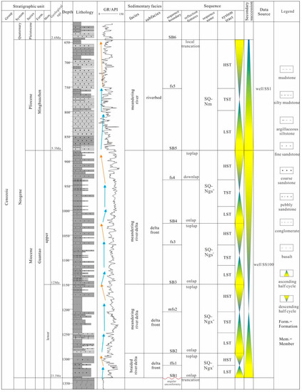 Finally, six sequence boundaries were identified, which were SB1–SB6, among which SB1 and SB5 are second-order sequence boundaries, and the rest are third-order sequence boundaries.