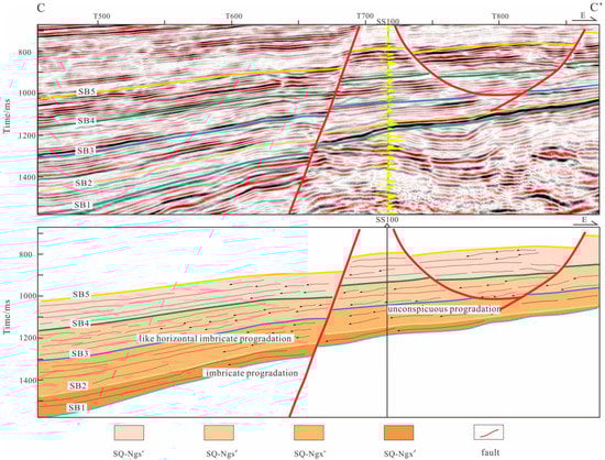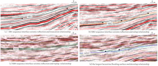 The second-order sequence boundaries are often related to the regional tectonic movements [46,47,48]. SB1 is a regional angular unconformity, formed by the Dongying movement in the Bohai Bay Basin, which is also a boundary between the Paleogene and Neogene. It is obvious to see the onlap reflection above the boundary and the termination type of truncated seismic reflection below the boundary (Figure 4a). The difference between the lithology and log characteristics is great across the unconformity surface. Above the boundary, glutenite deposits are developed; thus, the gamma-ray (GR) log curve is micro-toothed, box-shaped and funnel-shaped, while below the boundary, the volcanic rocks of the Dongying Formation are generally developed, with the GR log curve being low-amplitude straight-toothed (Figure 3). SB5 is the boundary between the Guantao Formation and Minghuazhen Formation, formed by the Neotectonic movement. There is no obvious sedimentary discontinuity, and only the local truncation reflection characteristics can be seen. Above the boundary, the seismic reflection continuity at the bottom of the Minghuazhen Formation is poor, and the amplitude changes greatly, while the seismic reflection continuity at the top of the Guantao Formation below the boundary is good and the amplitude is strong (Figure 2). SB5 is also a lithologic abrupt-change surface, with a large set of gray gravel sandstone and sandstone deposits above the boundary, and the GR shows a low value. Below the boundary, fine sandstone and mudstone, with fine lithologic grain size, are interbedded, and the content of sandstone gradually increases upward, with the GR at a high value (Figure 3).