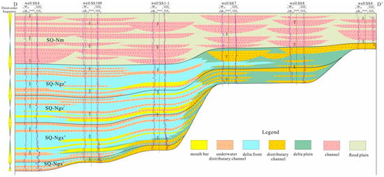 In the SQ-Ngsl and SQ-Ngsu, the ranges of the meandering river delta front and plain gradually enlarged, and the delta front sand body was widely distributed, showing the characteristics of the superimposed and contiguous distribution. Sedimentary microfacies were mainly front subaqueous-distributary channels, estuary bars and plain distributary channels. The lithology of the SQ-Ngsl was mainly mudstone interbedding with fine sandstone, and the subaqueous-distributary channels were superimposed vertically in multiple periods. The thickness of the single-layer sandstone was between 0.5–18 m, with an average of 4.5 m, and the sand-stratum ratio was about 44%. The lithology of the SQ-Ngsu was similar to that of the SQ-Ngsl, but the sandstone content obviously increased at the HST of the sequence. The gray-green mudstone deposits in the weak oxidation-weak reduction environment also appeared in the delta front, showing multi-stage superimposed channels, both vertically and transversely. The thickness of the single-layer sandstone ranged from 0.5 m to 28 m, with an average of 5.53 m, and the sand-stratum ratio was about 46% (Figure 8 and Figure 9).