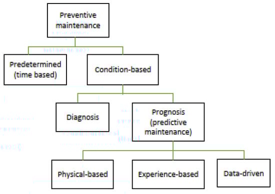 Predictive maintenance, which is a type of condition-based maintenance, uses prognostic models to foretell the equipment, component, or machine condition. These prognostic models continuously monitor the under-test equipment’s or component’s parameters using sensors such as energy analyser modules, temperature, vibration, corrosion, humidity, etc., for the purpose of building a training model so that the model can foretell/predict the failure in the equipment before it occurs [,,,]. Figure 1 shows the taxonomy of predictive maintenance.