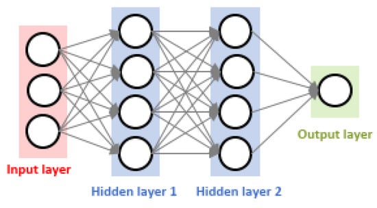Machine learning (ML) and deep learning (DL) algorithms can be used for predicting anomalies in industrial equipment or in a machine part. ML algorithms learn the system’s behaviour and patterns from training data. The trained model is then used to determine prediction on new incoming sample data. Deep learning (DL) is a subset of ML algorithms that uses one or more hidden layers with several processing neurons known as nodes (Figure 2) []. Figure 2 shows a simple artificial neural network (ANN) with one input layer accompanied by three nodes representing the data coming from sensors or desired equipment parameters, two hidden layers with four processing nodes and one output layer with one node. ANNs are good at function approximation and system parameter learning with feed-forward and back-propagation, respectively. This learning process is extensively discussed in [,,].