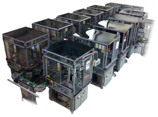 The FASTory production assembly line (Figure 3) [] was used as a testbench in this research work. In the past, the FASTory line was used in a factory to assemble cell phone parts such as frames, keypads and screens. After retrofitting the FASTory line, it now simulated its original cell phone assembling operations by drawing main cell phone parts (frames, keypads and screens) in different shapes and colours onto paper carried by a pallet. Figure 4 [] shows the layout of the FASTory line.