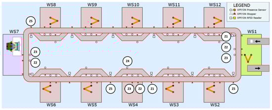 On each production workstation, the main conveyor transferred a pallet to the robot, and a bypass conveyor transferred the pallet to the next available station when the workstation was busy. The FASTory line followed the closed loop topology which provided an uninterrupted path for pallets, thereby increasing the productivity/space ratio. The two conveyors split into different zones, which are marked in Figure 4 and referred to as Z# in this paper. The entry and exit points of the workstations were located at Z1 and Z5, respectively. The main conveyor had four zones (Z1, Z2, Z3 and Z5), and for each zone there was a stopper and presence sensor for stopping a pallet and checking the presence of a pallet. Z3 was the production zone of each workstation. The Z1 of each workstation had a RFID tag reader, which was used to read the pallet ID. The Z1 of the current workstation and Z5 of the next workstation were the same. The bypass conveyor had one zone (Z4) and one stopper.