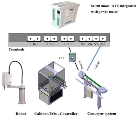 In this paper, the relevant data generated from the testbench were related to the power consumed by the conveyor belt motor driver. As mentioned in Section 3, all the workstations of the FASTory line were equipped with an E10 energy analyser module, which is an expansion module to the S1000 controllers and provides three-phase electrical power consumption monitoring (See Figure 5) []. Phase A was assigned to the robot, Phase B was allocated to the cabinet, I/Os and the controller, while Phase C was assigned to the conveyor system (including main and bypass conveyors). Power was measured with sampling current and voltage. The current sampled with a current transformer (CT) (which measured the high voltage current) was connected to the +Ia−, +Ib− and +Ic− terminals. The voltage was measured through a direct connection of the three phases (Va, Vb and Vc) and the neutral (Vn) terminals of the E10 expansion module. The Phase C energy values were of interest in this paper.